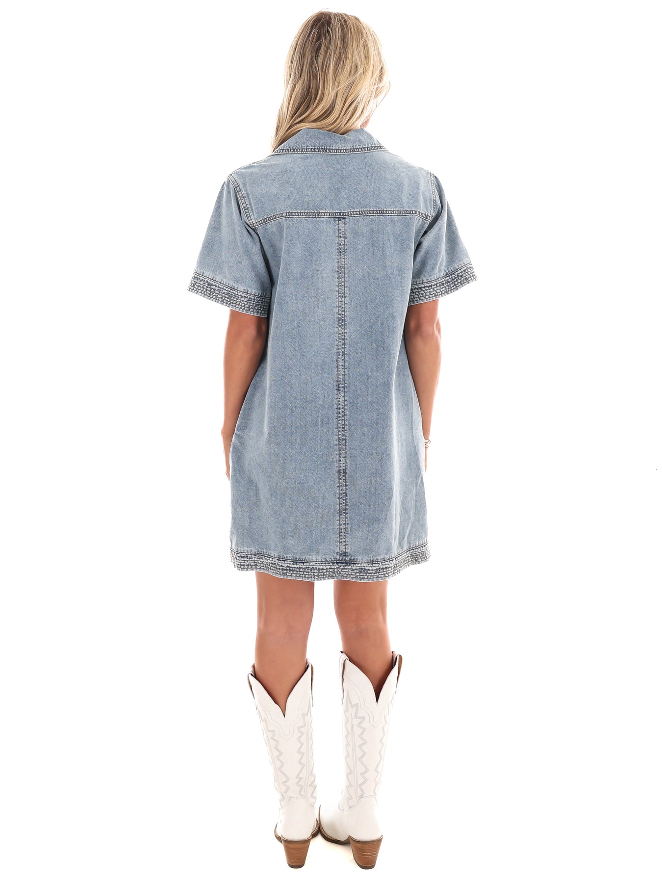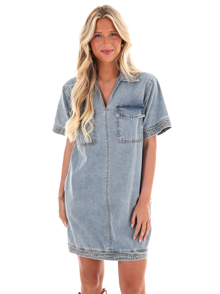 Introducing the See the Good Denim Dress - your new go-to for effortless style. Made with short sleeves and a washed denim fabric, this collared dress features intricate stitching detail and convenient pockets. Stay stylish and comfortable in this must-have piece!