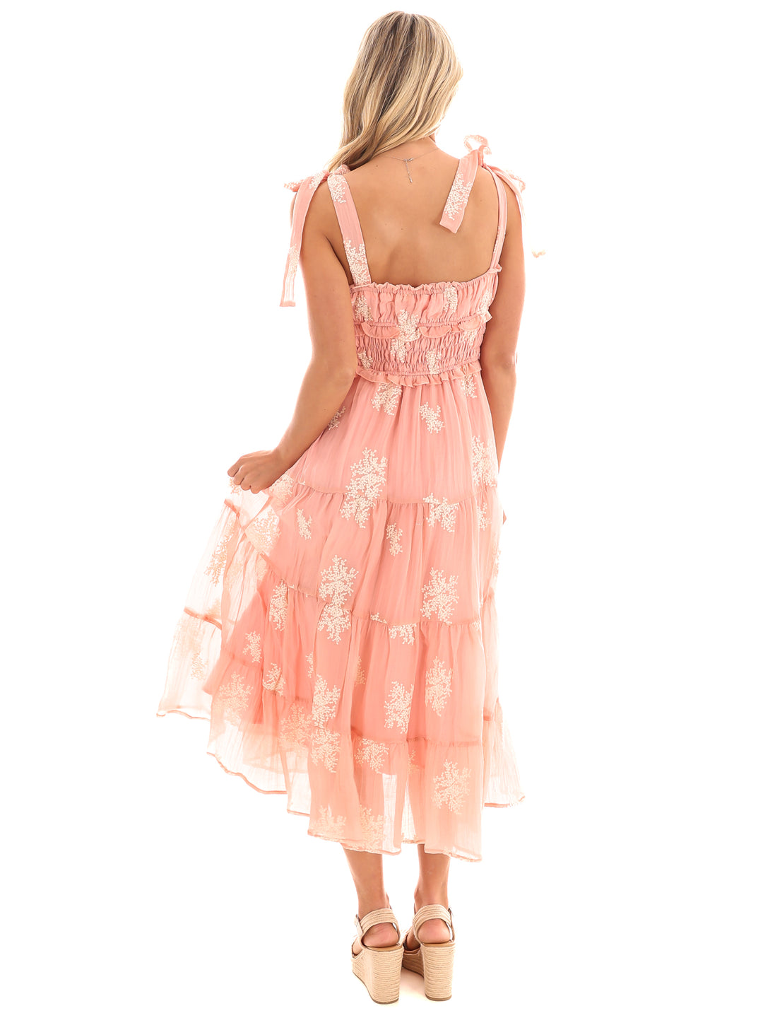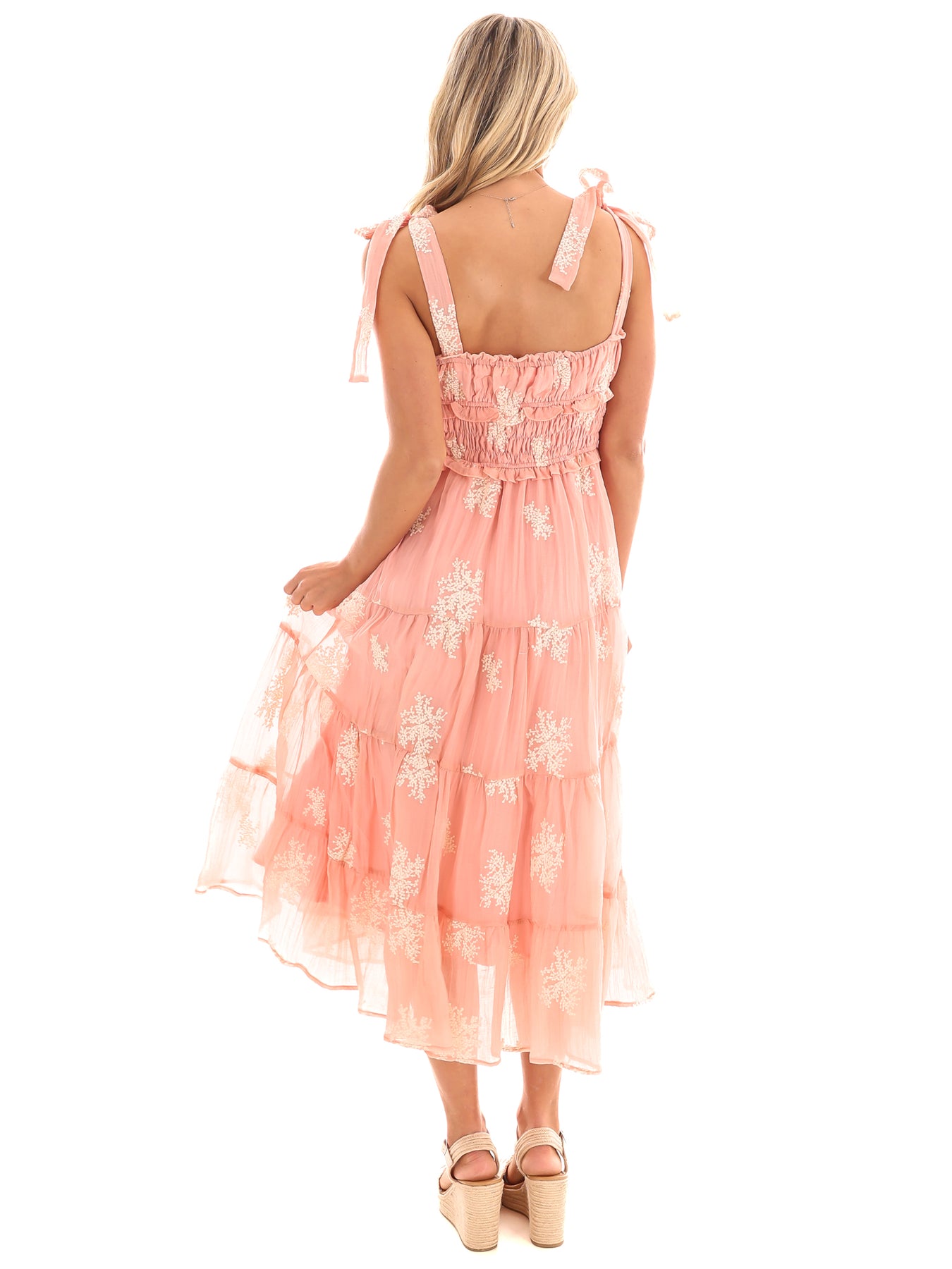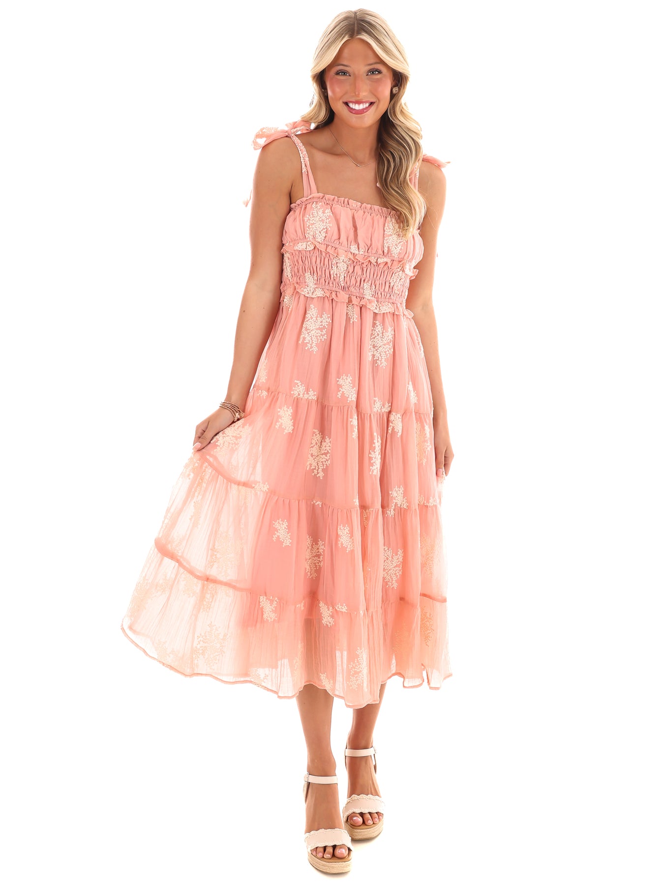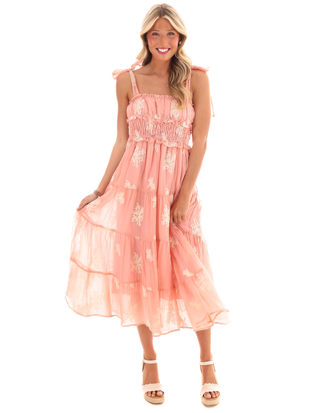 Elevate your style with our Setting the Scene Embroidered Maxi Dress! Showcasing a square neckline and adjustable tie shoulder straps, its smocked bodice with ruffle details flatters your figure while the flowy tiered skirt, adorned with intricate embroidered floral patterns, adds a touch of whimsy. Comes with a soft lining for all-day comfort and a polished finish.