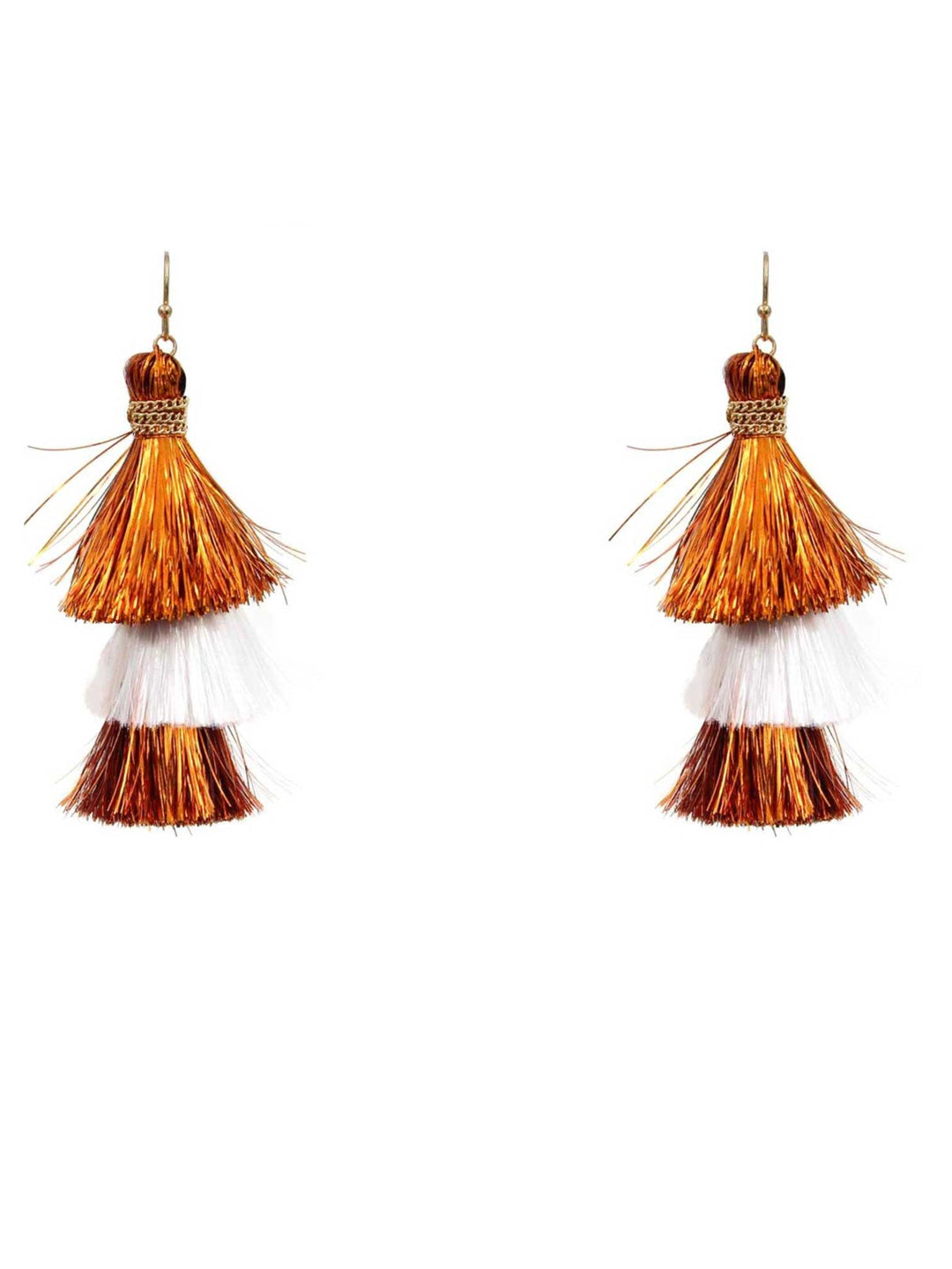 Cheer on your favorite team while wearing these fashionable Shimmer Tassel Gameday Earrings! These 2" orange and white dangle earrings add the perfect touch of sparkle and color to your look. Perfect for game day and all your other occasions! Go team!