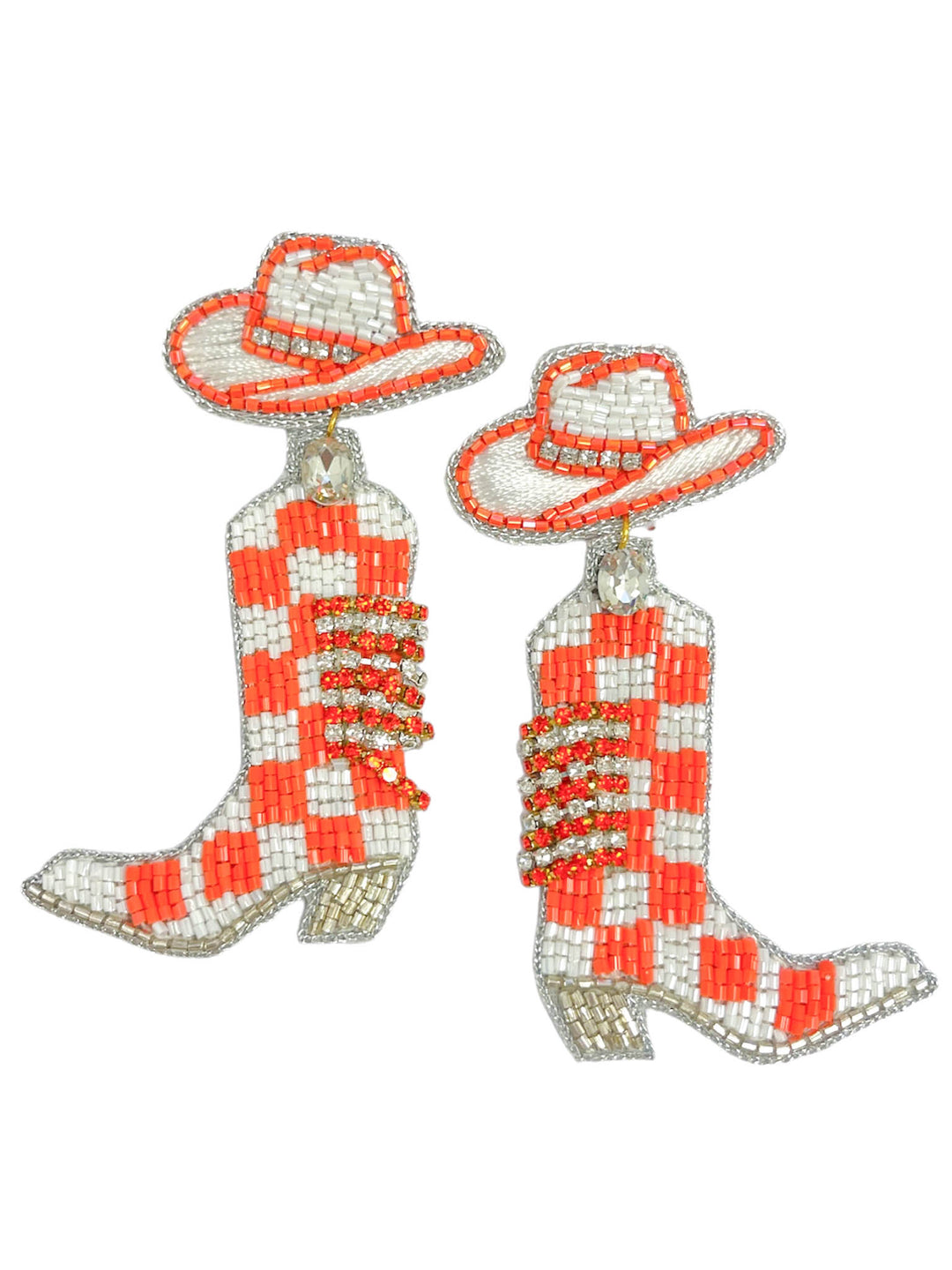 Show off your love for all things Gameday with these stunning Smokey Checkered Boot Earrings! Crafted with seed bead checkered cowboy boots and hat, these earrings will ensure your style stands out and WOWs your friends! So get ready to hoot and holler and don your boots with these fashionable earrings!