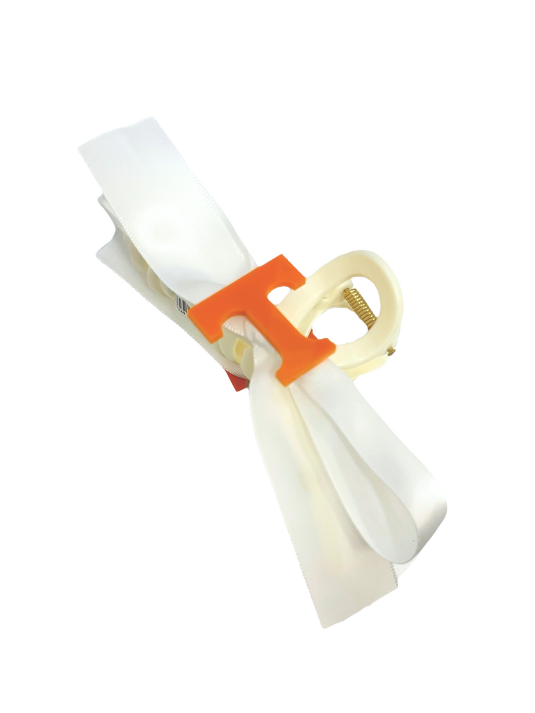 Show off your state pride with this playful bow claw clip, featuring a power T design. Perfect for holding back your locks with a touch of quirkiness. It's a unique and fun way to add some personality to your hair!