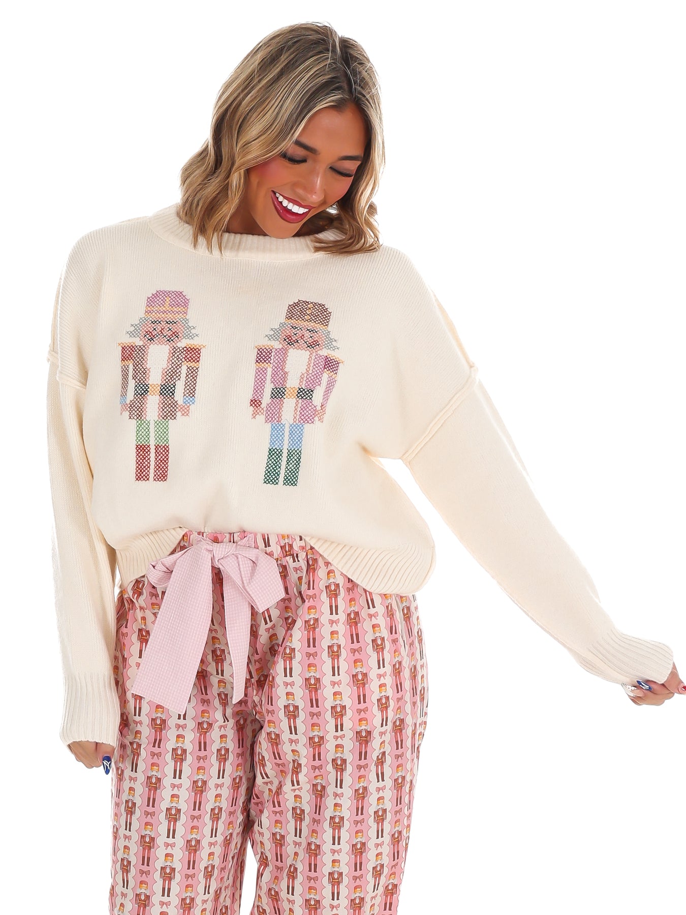 Twirl into the season with this whimsical Sugar Plum Nutcracker Embroidery Sweater! Featuring delicate, detailed embroidery of a charming nutcracker design, this cozy knit brings festive magic to your everyday wardrobe. Perfect for holiday gatherings, winter strolls, or simply spreading seasonal cheer, it's the sweater that makes you smile every time you pull it on. Soft, comfortable, and undeniably enchanting—your new favorite piece awaits!