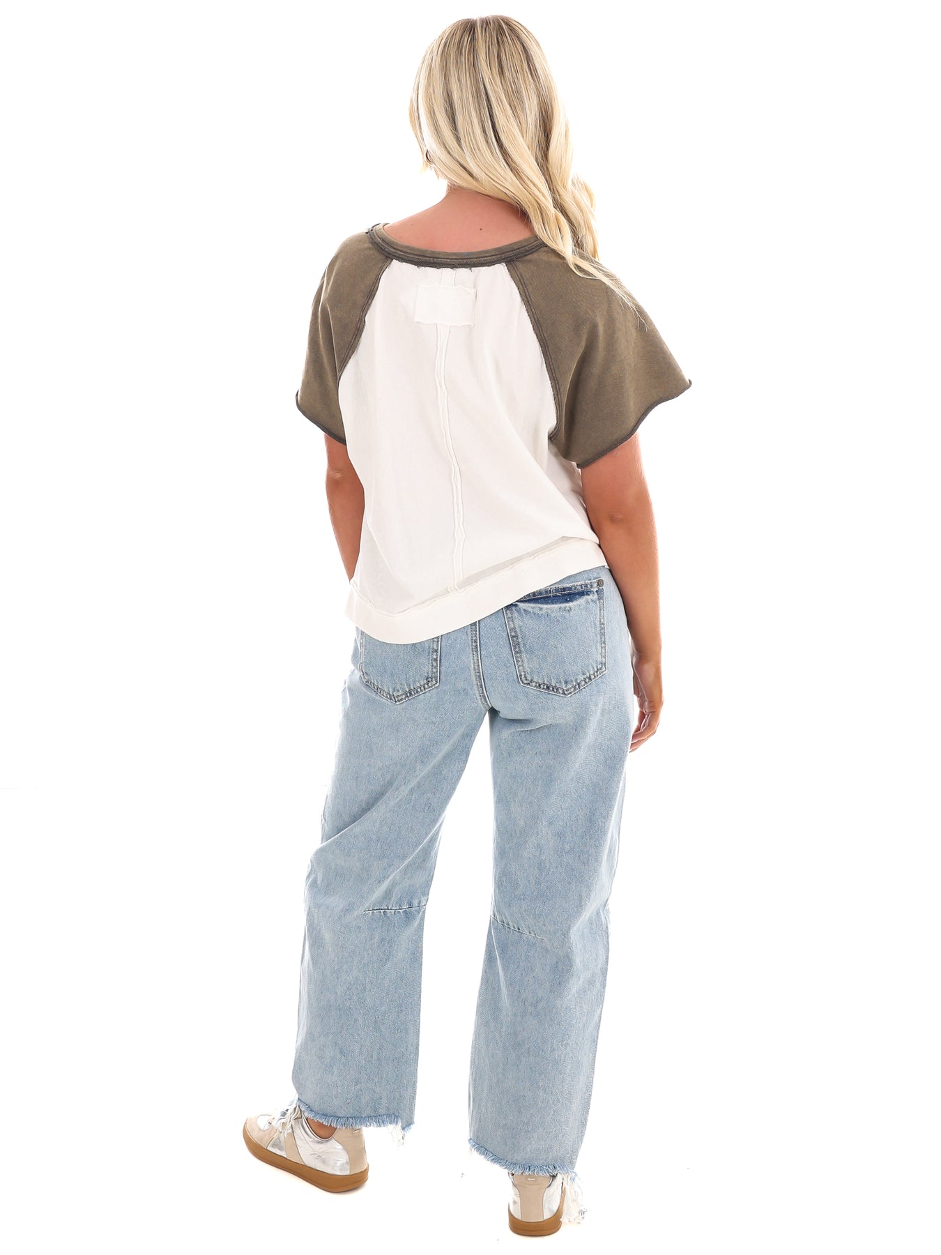 Introducing our Sweet and Simple Colorblock Top - perfect for a casual day out! Made with mineral washed fabric for a soft feel, this top features a trendy colorblock design, notched neckline, and unique frayed seams. The high-low hem creates a flattering silhouette.