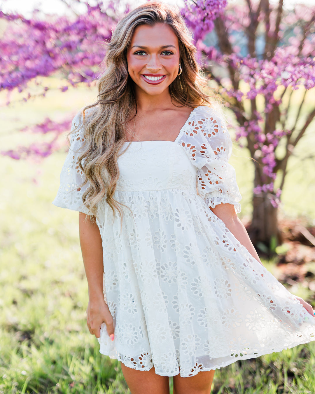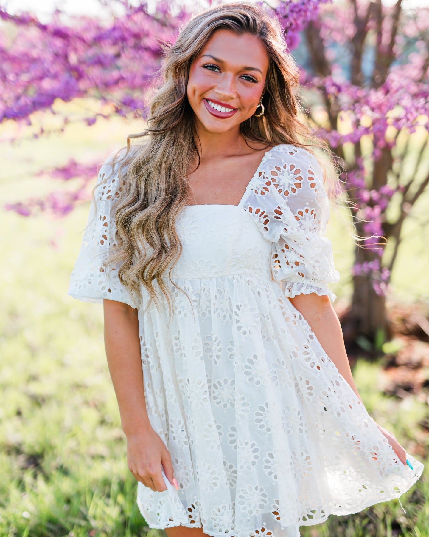 Experience the beauty of nature with our Through the Seasons Floral Babydoll Dress. Featuring a charming square neckline and puffy sleeves, this dress flatters your figure with an empire gathered waist. Perfect for any occasion, the back zipper allows for easy wear. Embrace the joy of daisies with this eyelet mini dress!