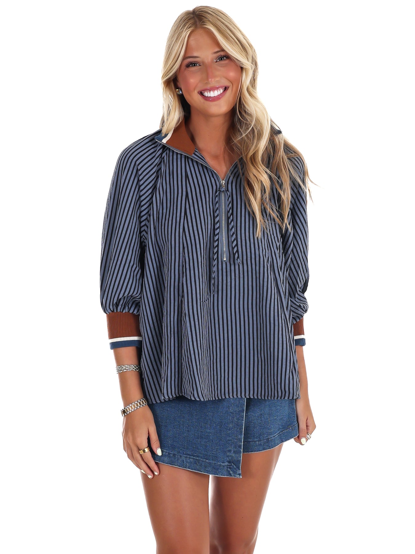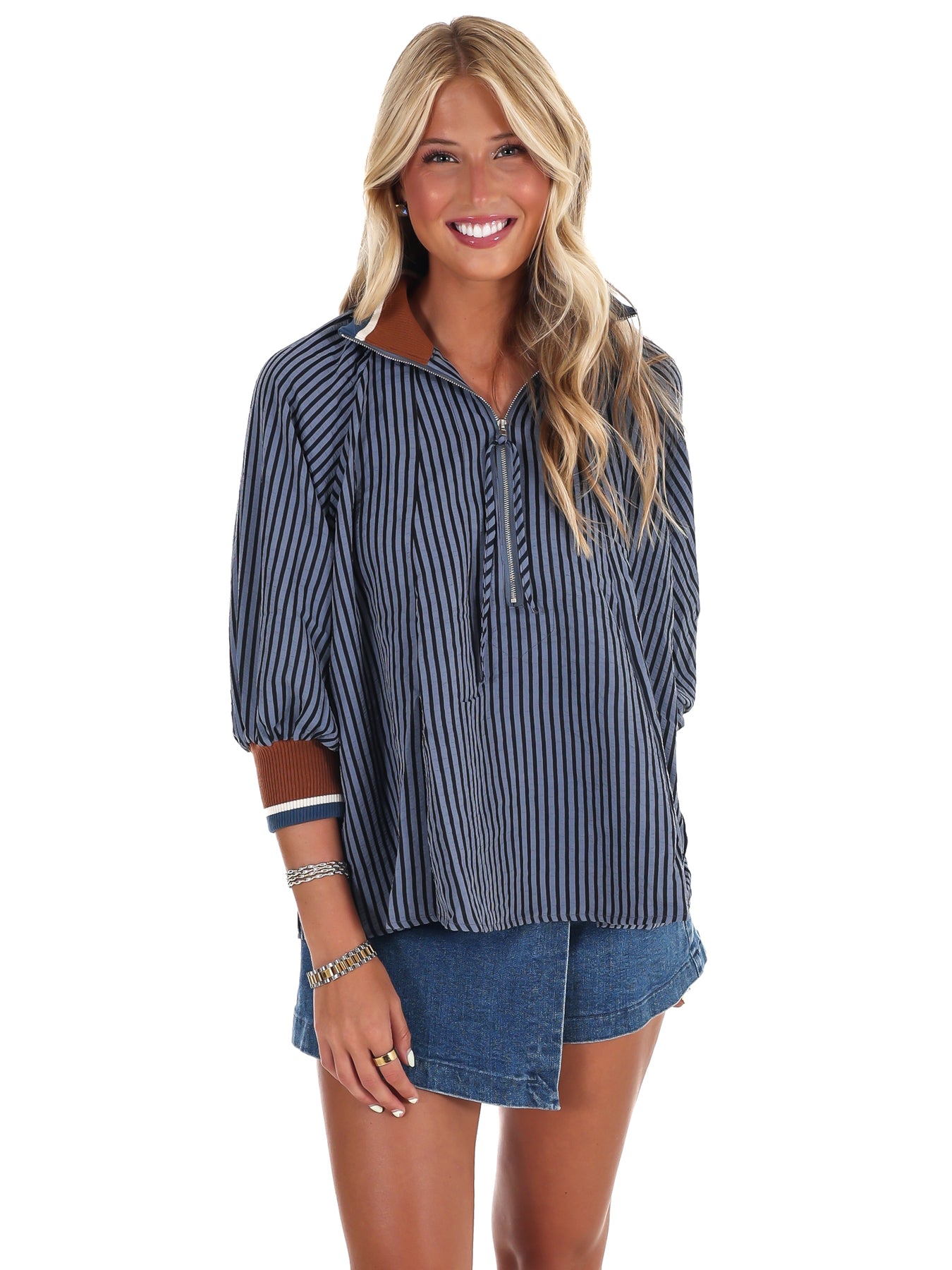Bring casual charm to your weekend with the Weekend Stroll Stripe Half Zip Top. Featuring playful stripes and a comfy 3/4 sleeve design, this half-zip top adds a fun twist to your laid-back looks. Perfect for strolls, coffee dates, or cozying up, it blends style and ease effortlessly.