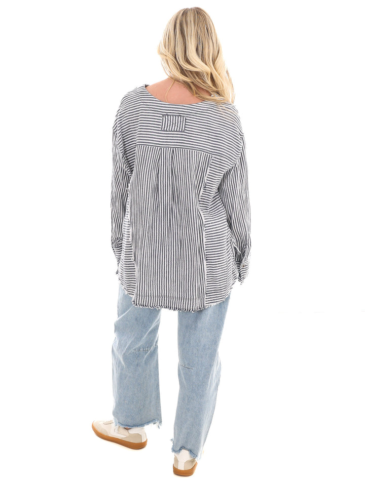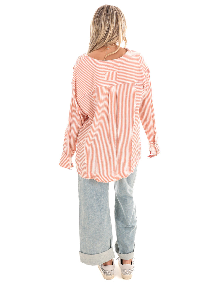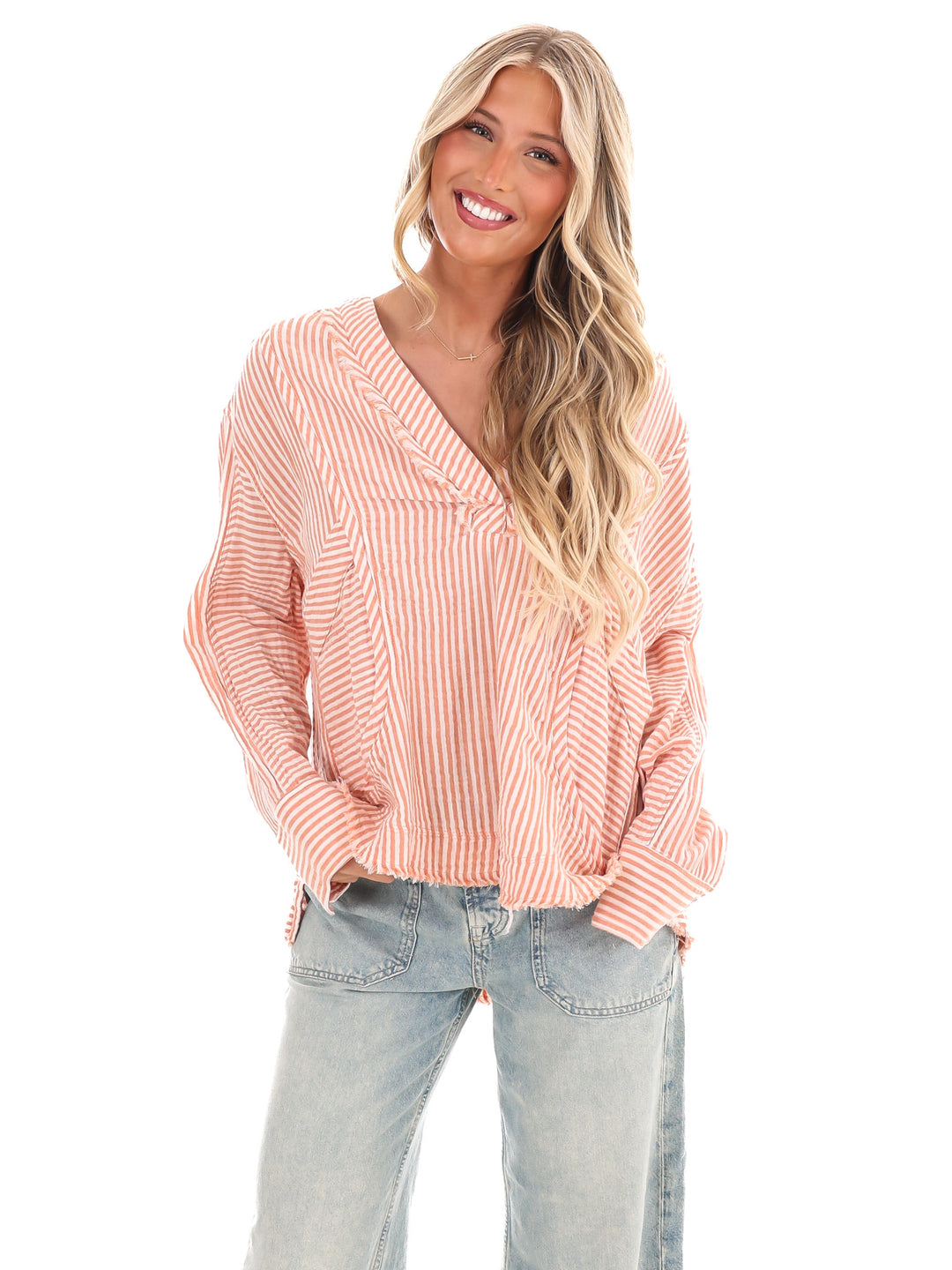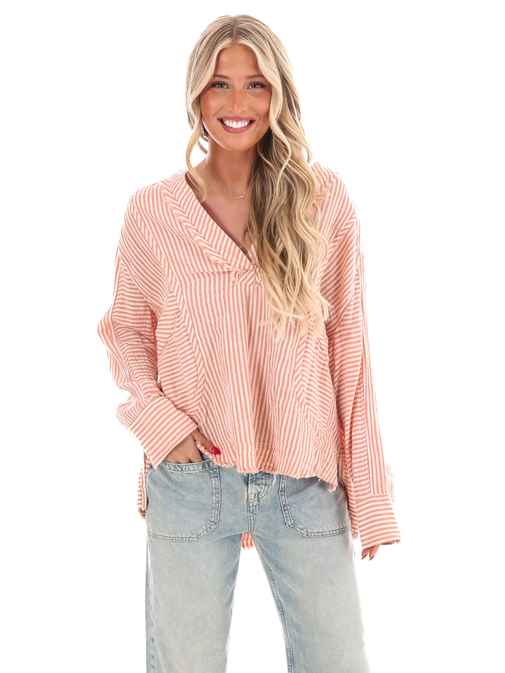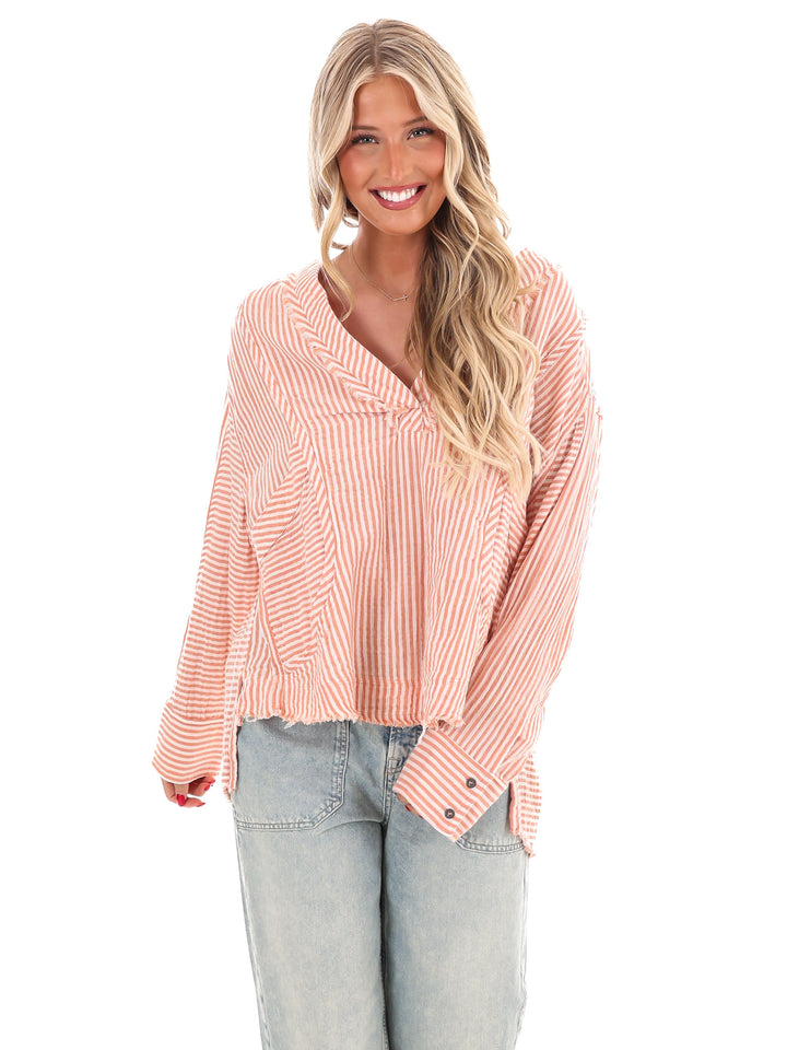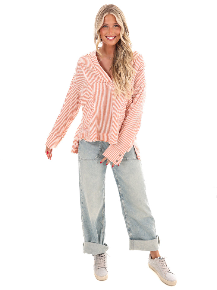 Get ready to feel at home in our Where You Belong Stripe Top! This mineral washed long sleeve top is not only stylish, but also features a V-neckline, two convenient side pockets, buttoned cuffs, and a unique pleat in the back. The high-low design, frayed bottom hem, and slight boxy silhouette add the perfect touch of edge. You'll never want to take it off!